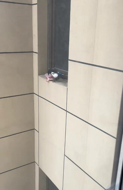 这一幕被隔壁邻居崔先生用手机完整记录了下来。崔先生说,他了解到该住宅由附近工地工人租住。由于未配备冰箱,租户冬日习惯将食材直接存放在窗外。此前已多次发现麻雀等鸟类前来觅食,但喜鹊如此淡定地啄食肉类还是第一次看到。
