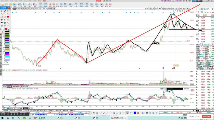 可以看到这是第三段上弓,换个颜色,然后第三波上弓又走了一个第一个中枢,第二个中枢,五段式的上涨,然后在一个回落过程中,一个下跌三角形的回落过程中下降三角形。
